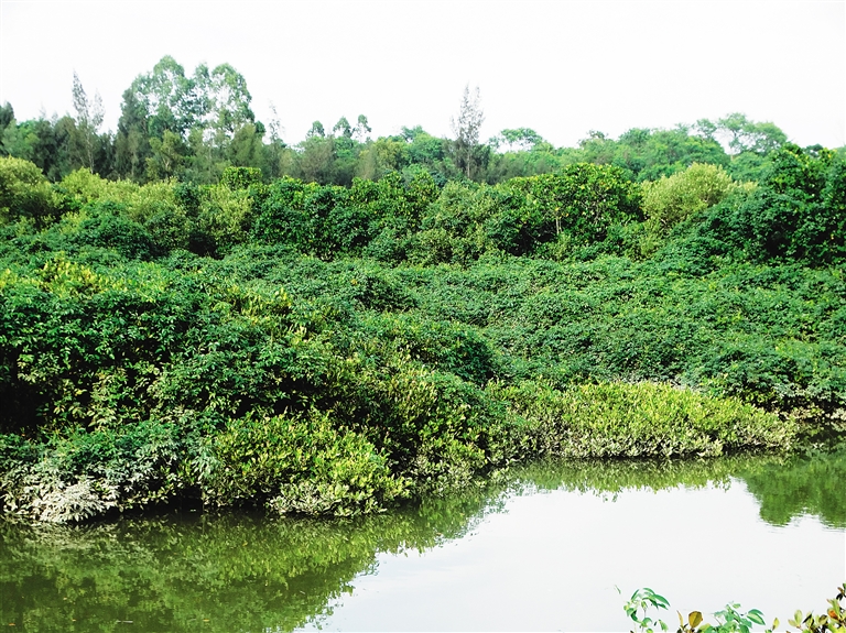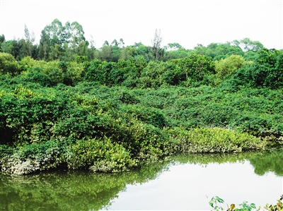 红树林受鱼藤影响的现象,在北门江入海口处尤为明显:原有红树林群落中出现被鱼藤覆盖的大小不等、颜色深绿的斑块,椭圆状叶随枝开散,又沿树攀爬,绿得肆意而密麻。