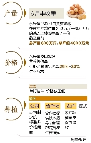 有了专业的技术支持,在今年6月中旬永兴黄皮丰收的季节,全镇13900亩黄皮果林,在往年年均产量约250万斤—350万斤的基础上整整提高了一倍。