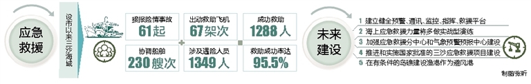 在“三沙1号”船上设立直升机停机坪,为海上应急救援提供流动保障;应对突发状况,三沙各部门建立应急联动机制,一有险情立刻启动响应;海事、卫生等部门实行24小时值班,三沙海域任何地点发生险情,及时救助…… 三沙应急救援不仅仅在岛礁上,更在200万平方公里海域上。三沙人正在用更加宽阔的视野,更有前瞻性的眼光,更加创新的思维,更有力地推进三沙海上应急救援工作和应急体系建设。