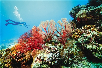 日前,来自北京的水下摄影师楠忘和他的潜伴马浚森受中央电视台的邀请,来拍摄三沙的水下影像资料。在为期三天的工作中,他们分别在三沙七连屿和永乐蓝洞两处海域共下潜了6次。楠忘告诉记者,三天里,他用相机和摄像机记录到:鱼群、成片的珊瑚群、奇特的海珊景观和簇拥海葵生长的小丑鱼等热带海域比较常见的生物。“太惊喜了,有些水下景观甚至可以用惊艳来形容。”楠忘激动地说。