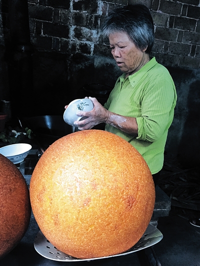 厨房里的灶台旁,王朝蓉的二儿媳已经用晒干了的椰子叶生好了火。一口大锅足足一米宽,油温太高,煎堆表面就会起泡,最终裂开,而油温过低,煎堆则难以膨胀成型。控制好油锅的温度,把刚才好不容易团成的球袋放进锅里,王朝蓉左手拿着长长的竹筷轻轻固定球袋并慢慢滚动,另一只手掂起长柄勺快速翻滚着球袋并均匀淋油。在持续不断地翻滚和浇油过程中,在温度和时间的作用下,球袋里的空气升温并逐渐膨胀,球袋慢慢变大、变得金黄……直至成为比排球还大的煎堆。“要及时吃的话,表皮酥脆,就不能炸太久,而要放久一点,就可以稍稍多炸一会儿。”王朝蓉对于火候的把握可谓炉火纯青。