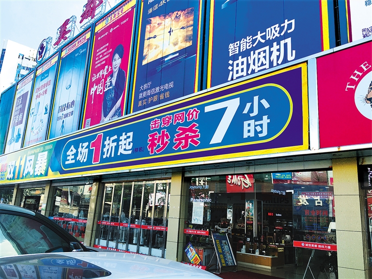 同样推出双十一活动的还有某电器卖场。该店的促销活动为“双十一风暴,全场一折起(样机),击穿网价秒杀7小时”,活动时间为11月11日下午3点到晚上10点。此外,商家还推出了多款原价数百元、“双十一”限量价格11元的商品来吸引消费者。商品有电水壶、机械微波炉、饮水机等。