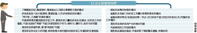 据介绍,我省成立了脱贫攻坚明查暗访督查工作领导小组,由胡光辉任组长。领导小组下设三个督查组,由省委办公厅、省政府办公厅牵头,同时抽调省农业厅、省住建厅、省扶贫办、省财政厅、省教育厅、省卫计委、省审计厅等有关单位人员组成。各督查组从今年11月份开始进行第一轮督查,并根据工作需要,以问题为导向,视情定期不定期明查暗访,建立常态化工作机制。督查采取随机抽样和实地调研相结合,“听、谈、查、看”的方式,进村入户,深入了解扶贫工作情况。