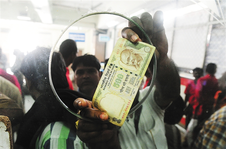 11月9日,在印度城市安拉阿巴德火车站,印度乘客使用旧版500卢比的钞票购买车票。 印度总理莫迪8日晚宣布,废除目前市面上流通的500卢比(约合7.5美元)和1000卢比(约合15美元)两种旧版高面值货币,以打击腐败和黑钱交易。 新华社/法新