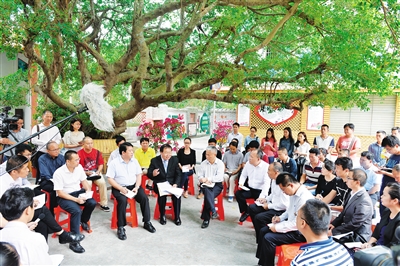 11月9日中午,海口市博桂社区迎来了一批特殊的客人——中央宣讲团成员、全国政协社会和法制委员会副主任施芝鸿一行。他们在省委常委、宣传部长许俊的陪同下,与社区党员干部、普通群众在大榕树下促膝长谈,围绕学习贯彻党的十八届六中全会精神展开交流探讨。