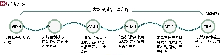 1982年,大坡镇开始胡椒种植,产业开始起航。2005年,大坡镇开始创建500亩胡椒标准化生产示范园,改进传统管理模式;2010年,大坡镇兴建4个活水浸泡胡椒池,改进胡椒加工工艺,产品品质进一步提升;2012年,大坡胡椒产地东昌农场的“昌农”牌胡椒商标被认定为海南省著名商标;2013年,东昌农场与农科院共同研发的新胡椒加工生产线投入使用,开发除了胡椒酱、胡椒油等系列产品,延伸产品产业链。如今,大坡胡椒种植面积已达到4万亩左右,在逐步扩大种植规模的同时,更是引进欧盟良好农业标准,实现专业化种植,不断提升胡椒品质。