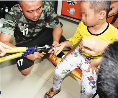 在医务室,医生给小男孩手指肿胀部位进行消炎麻醉,随后,消防官兵对小孩手指进行保护并对门把圆环进行破拆,成功将圆环套取出。