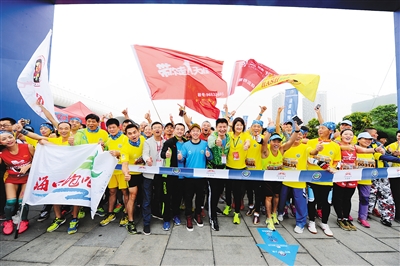 11月11日,迷你彩色马拉松在海南国际会展中心开跑,赛程全程4.5公里。篮球名将宋晓波、奥运冠军郭伟阳、体操名将王冠寅、“徒步小子”李新等体坛名将领跑助阵。图为彩跑现场。本报记者 袁琛 摄