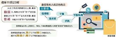 11月11日当天,仅一个小时2016天猫“双11”全球狂欢节海南交易额就达到2.15亿元。截至11日12时,海南“剁手族”购买成交额达到4.78亿元。而2015年11月11日14:00,海南成交额仅为3.4亿元。