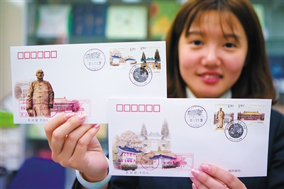 工作人员展示《孙中山诞生一百五十周年》纪念邮票首日封。11月12日,中国邮政将发行《孙中山诞生一百五十周年》纪念邮票1套4枚,纪念孙中山先生诞生150周年。该套邮票图案内容分别为:孙中山故居纪念馆、孙中山铜像、中山公园中山堂、中山纪念中学,全套面值5.40元。 新华社发