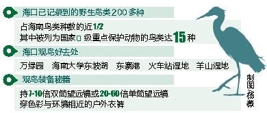 那么,海口有哪些观鸟的好去处?“不方便走太远的,大家可以到万绿园、海南大学东坡湖转一转,那里视野开阔,爱好者也容易接近鸟类。有条件的,我更建议到东寨港、火车站湿地、羊山湿地等地瞧一瞧,特别是东寨港。”冯尔辉介绍,东寨港是我国最大的红树林保护区,更被《中国国家地理》评选为“中国最美八大海岸”之一。近10年的“海南越冬水鸟调查”表明,那里是海南水鸟种类和数量最多的地方,鸟类种数约200种。“无论海水涨潮或退潮,那里都会有一片好景致。”