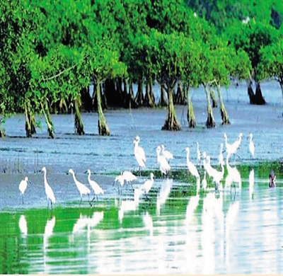 新盈红树林系国家一级湿地保护区,这一带表层成土母质是浅海沉积物和近代沉积物,属全新世的海柑堆积物。这里远离人类的侵扰,是湿地以及濒临灭绝动物类的天堂。据文献记录和近年调查,这里有维管束植物、被植物149种,陆栖脊椎野生动物包两栖纲、爬行纲就有20目47科145种之多。仅国家II级重点保护物种11科,被列入中国濒危动物红皮书的物种有13科,鸟纲14目35科114种。落潮时,坐在小舢板上行走于红树林之中,亦可时不时看到有虎纹蛙、灰鹤、小青脚鹬、褐翅鸦鸥、小鸦鸥等国家重点保护物种跳跃着或爬行着,展示着野性的悸动。站在岸边远眺,还常常看到白腹海鸥、鹗、红隼、画眉、黑脸琵鹭等国家珍稀濒危物种从高空中鸣叫着往红树林俯冲呢。
