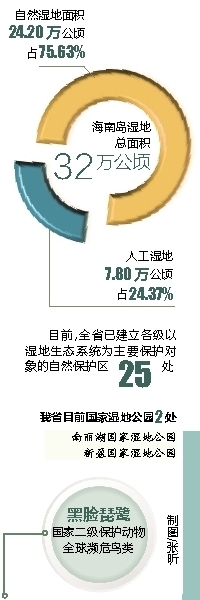 据统计,海南岛湿地总面积32万公顷,其中,自然湿地面积24.20万公顷,占75.63%,人工湿地7.80万公顷,占24.37%。目前,全省已建立各级以湿地生态系统为主要保护对象的自然保护区25处。