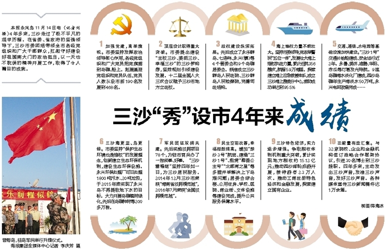 顶层设计取得重大突破。市委提出建设“主权三沙、美丽三沙、幸福三沙”的三沙梦构想,坚持规划引领建设发展。十二届全国人大三次会议赋予三沙市地方立法权。