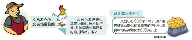 实际上,在文昌公坡、抱罗、翁田、昌洒、东路、锦山等乡镇,“公司+农户”的模式为当地农户脱贫、减贫产生了极大的推动作用。公司除了为农户提供鸡苗、饲料、技术扶持等,还按固定价格回收肉鸡,即使肉鸡价格出现波动,养殖户的收入也有保障,不再怕肉鸡价低伤农了。从2008年至今,文昌已有600多户农户加入到养殖公司提供的文昌鸡的行列中,农民年均经济增收达6万元以上。