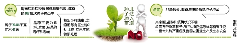 据海南检验检疫局相关负责人介绍,我国在《禁止携带、邮寄进境的动植物及其产品名录》明确禁止携带和邮寄种子、苗木及其他具有繁殖能力的植物材料进境。非法携带、邮寄进境的植物种子种苗,其来源、品种和疫情状况不明,极易携带杂草种子、害虫、植物病原体等有害生物,一旦传入将严重危及我国农畜业生产及生态安全。
