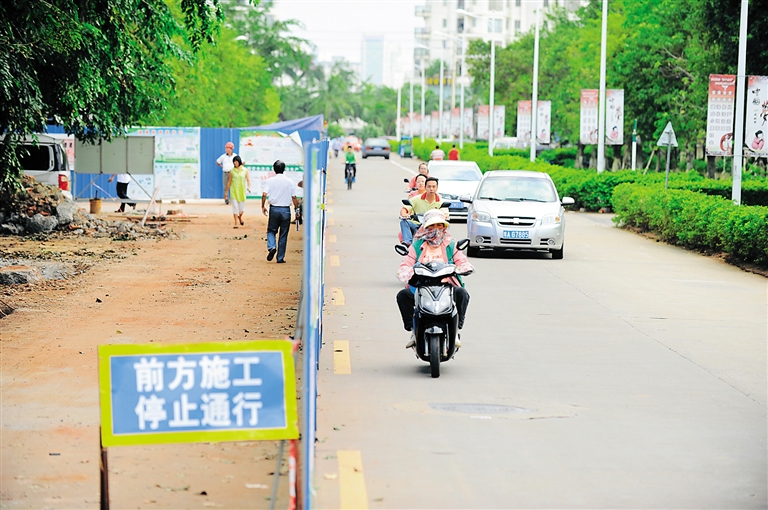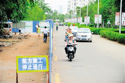 海口市美兰区万恒路,排污水管道施工占去了半幅道路,不仅容易造成拥堵,而且给步行者造成很大不便。