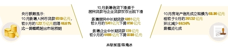 央行数据显示,10月新增人民币贷款6513亿元,较9月的1.22万亿元回落46.61%,这一降幅略超出市场预期。此前,10家机构对10月新增信贷的预测,其中2/3的机构给出了超7000亿元的估算。
