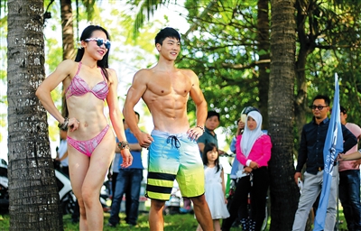 11月20日,参加第6届三亚国际沙滩健美先生比基尼小姐大赛的选手在三亚湾进行沙滩造型训练。本报记者 武威 摄
