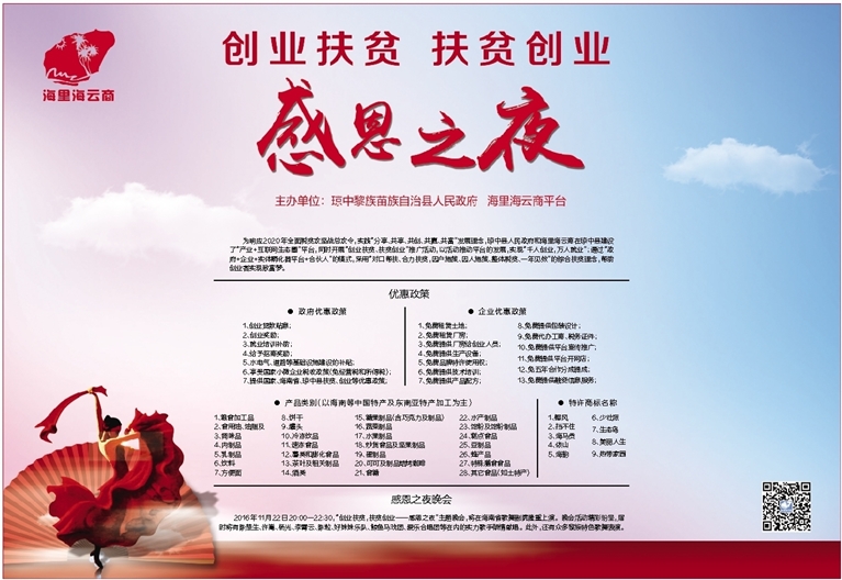 2016年11月22日20:00—22:30,“创业扶贫,扶贫创业——感恩之夜”主题晚会,将在海南省歌舞剧院隆重上演。晚会活动精彩纷呈,届时将有陈楚生、许嵩、杨光、李霄云、陈粒、好妹妹乐队、鲸鱼马戏团、爱乐合唱团等在内的实力歌手倾情献唱。此外,还有众多黎族特色歌舞表演。