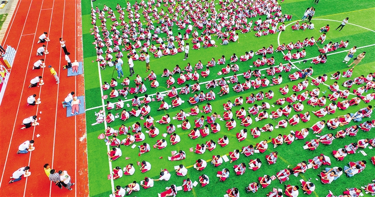 11月17日,在海口玉沙实验学校,约800名学生在海南省红十字会志愿者的示范下集体学习应急救护知识。 本报记者 张茂 摄
