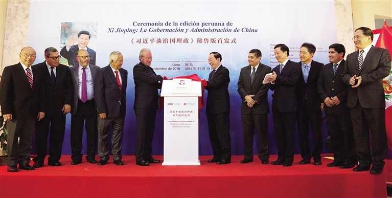 中宣部常务副部长、中央文明办主任黄坤明出席仪式并致辞指出,在习近平主席对秘鲁进行国事访问并出席亚太经合组织领导人非正式会议之际,成功出版《习近平谈治国理政》秘鲁版具有特殊意义。习近平主席这部著作是理解把握当代中国的一把钥匙,相信随着它的出版发行,将使更多的秘鲁和拉美读者了解习近平主席治国理政的新理念新思想新战略。
