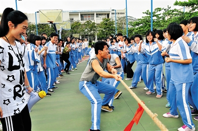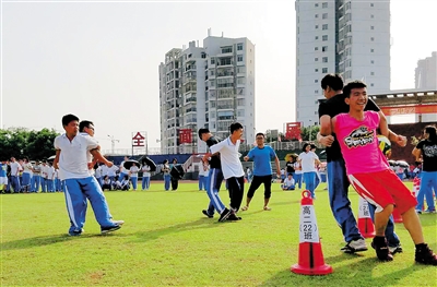 海口一中体卫艺处主任杨文刚告诉记者,自2008年开始,每周二下午4点半至6点半,一中的操场里,就会上演一场场好玩、刺激的游戏比拼,大家都把这个时间称之为“大课间”。在这个时间段,所有高三年级的学生被分为4个大方块,每个方块由固定的班级数组成,方块里的班级将进行统一的游戏比拼。通过这种方法,帮助学生达到锻炼的目的。