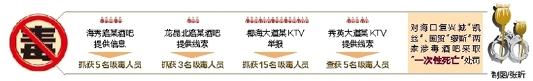 龙华警方根据海秀路某酒吧提供的信息,成功抓获陈某等5名吸毒人员;根据龙昆北路某酒吧提供的线索,将张某敏等3名吸毒人员抓获;根据椰海大道某KTV的举报,成功抓获15名聚众吸毒人员。