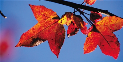 小路旁、溪水边、丛林里、山谷间,红艳艳、美灿灿,红枫叶傲笑其中。随着欣赏角度的不断变化,枫叶给人的美更为丰富多彩,泉水中漂浮的枫叶,在阳光的照耀下,显得晶莹剔透,背光赏枫,玛瑙花纹又是枫叶一绝。总之,枫叶的美随时而变,也许只有你置身其中,静心赏枫,才能真正感受到枫叶的美……