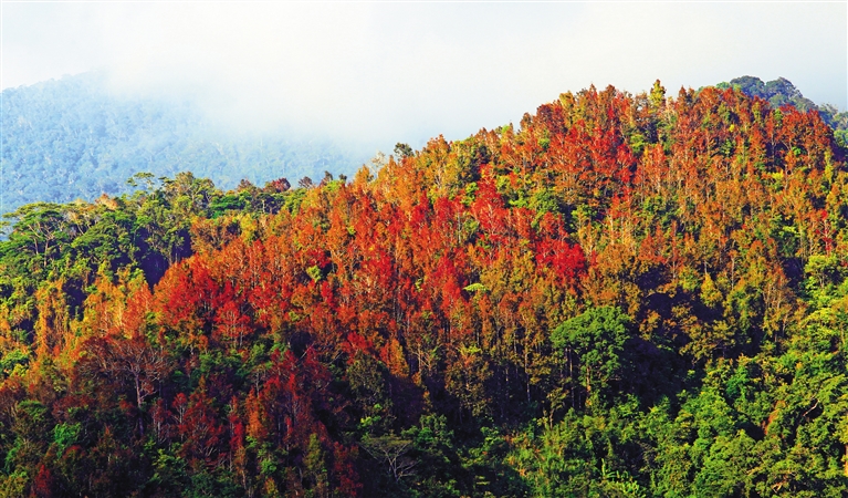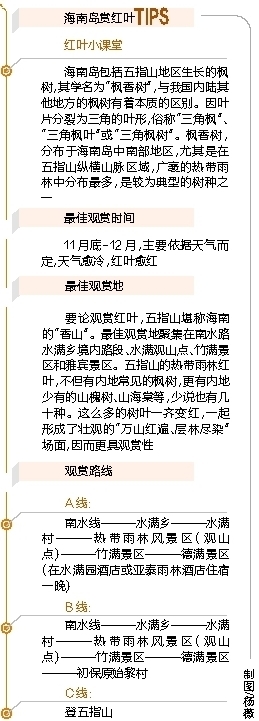 “那连绵不断的山峦,层层叠叠的火红枫叶,毫不逊色北京香山红叶。”每年都来海岛过冬的摄影爱好者李雷明这样评价五指山的红叶。