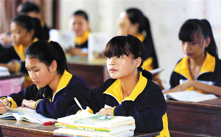 11月22日,儋州市海头中学,曾辍学打工的贫困学生蔡玉妃(前排右一)在课堂上认真听讲。