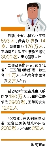 国家卫计委《关于加强儿童医疗卫生服务改革与发展的意见》提出:2020年每千名儿童床位数增加到2.2张,每千名儿童儿科执业(助理)医师数达到0.69名。据测算,2020年,要达到国家标准,我省还需新增儿科床位2000张,儿科医师650人。