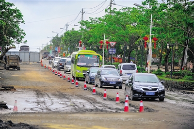 为此,记者联系到了道路施工方。据了解,该路段属于223国道嘉积—中原段改造工程中的一段。自去年12月进场以来,施工进程受到多方面影响,导致进度缓慢。此前,因附近的项目建设赶工,运输建筑材料的大货车来回穿梭,导致项目迟迟无法开工。之后的施工中发现路面下方还有排水管道和国防电缆,只能停工与相关部门协商。近期雨水较多,开挖的路面排水不畅,达不到施工条件。