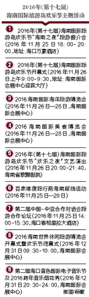 在三亚,第一届三亚西岛欢动海洋节、2016三亚目的地婚礼博览会、欧洲国家文化艺术活动,2016年海天盛筵—第七届中国游艇、公务机及时尚生活方式展,第八届三亚国际美食嘉年华将举行。