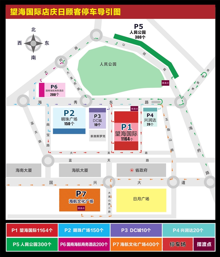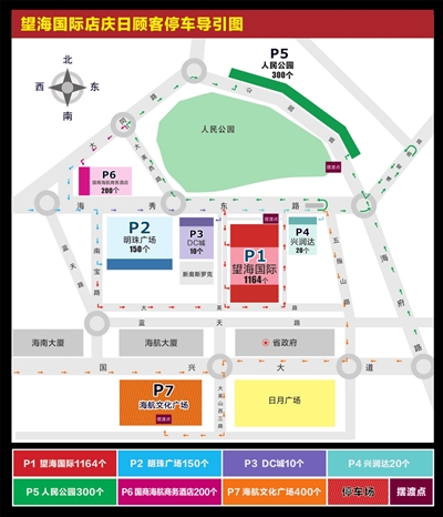 ◆海航文化广场、人民公园的顾客可在摆渡点搭乘摆渡车,往返P5、P7停车场及望海国际。(摆渡车停靠点:望海国际北广场、人民公园、海航文化广场)