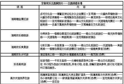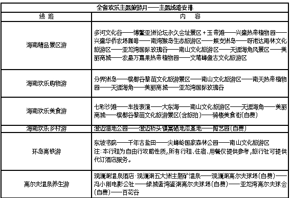 ③海南欢乐美食游,以在海口举办的海南国际美食博览会为中心,安排若干条海南美食体验旅游路线,集中宣传海南独具特色的美食文化。