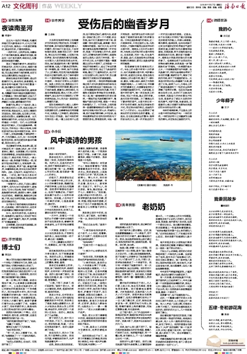 “你叫小南是吗?你在读什么?能给我看看吗?”我眼睛看着男孩手中的纸。男孩点点头,把纸递给我,上面是手写的几行字:“凯风自南,吹彼棘心。棘心夭夭,母氏劬劳。凯风自南,吹彼棘薪。母氏圣善,我无令人。爰有寒泉?在浚之下。有子七人,母氏劳苦。黄鸟,载好其音。有子七人,莫慰母心。”我知道,这是《诗经》中的《凯风》。这首诗赞美的是母亲的辛勤、劳苦、明理,颂扬母亲的美德,还表达了自己不成器难回报、宽慰慈母之心而惭愧不安的心情。