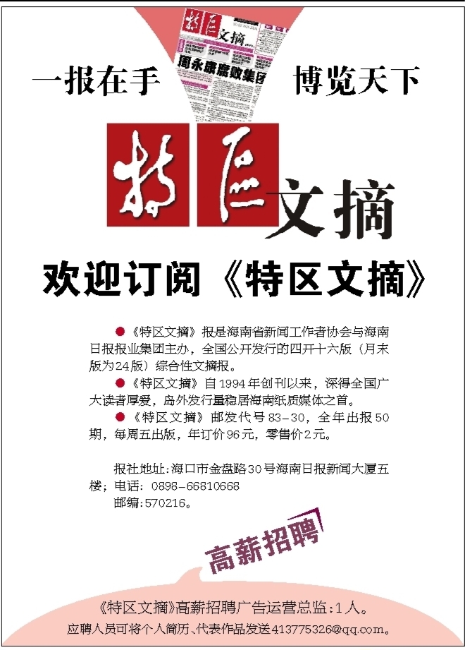 《特区文摘》高薪招聘广告运营总监:1人。