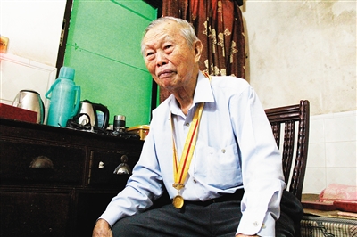 郑新忠说,想看看邢定标的抗日纪念章。在家人的搀扶下,邢定标走到书桌前,从抽屉里取出一个棕色的月饼盒。“这里面装的是我家最宝贵的东西。”盒子里整齐摆放着一条红色领带,这是几年前邢定标花50元钱买来,专门为每年参加黄埔军校同学会聚会准备的,还有一条妻子的项链,剩下的就是两块由官方和民间颁发的抗日纪念章了。