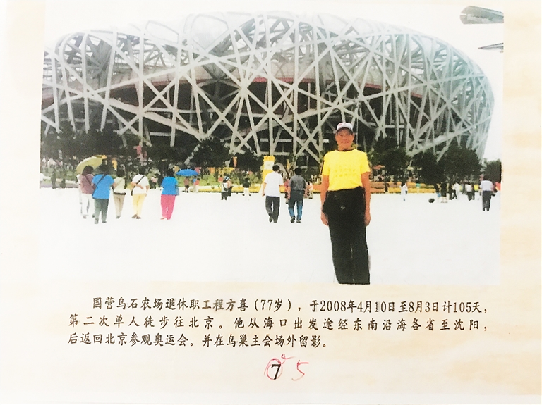 记者还发现,这次的徒步日记中少了很多对突发情况的描述和程方喜矛盾的内心活动,多了几分淡然与从容。“8月3日,我到达鸟巢,拍照留念后,我告诉自己,作为一个热爱体育生活的人,我能够亲眼目睹北京举办第29届夏季奥运会的盛况,也算是实现梦想了。”程方喜记录道。