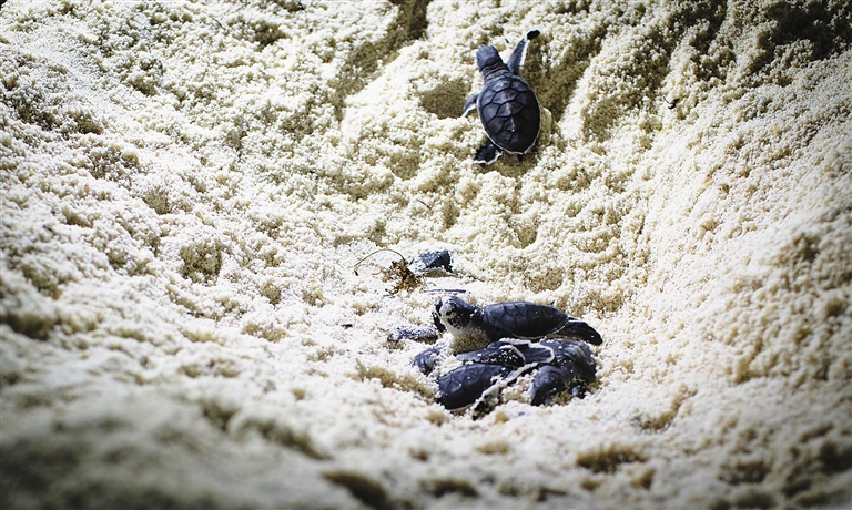 出壳后小海龟会在“卵坑”内大约待2天,之后便从厚厚的海沙下勇敢地往上钻出来,它身旁的海沙则不断地往下陷。