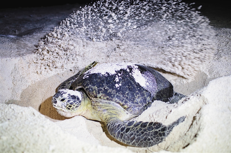 进入深夜,海龟妈妈们会选择晚上10时到次日凌晨3时来到岛上,筑巢产卵,这个时候,她们往往趁海水涨潮时,借助潮水爬上海岸活动。