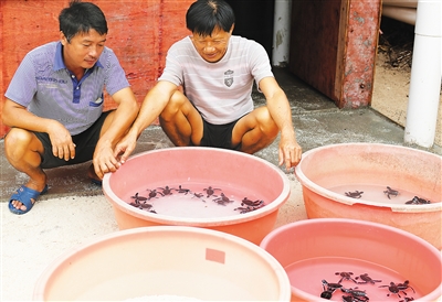 “小海龟,你要归大海了,我祝你平平安安,长大以后再回来看我们。”今年盛夏的一天,在海浪顺畅的时候,渔民黄宏波手捧着刚刚养大一点的小海龟,将他们放入大海,满脸笑容。