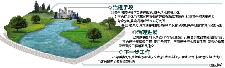 目前,桑德公司已完成美舍河下游26个排污口的截污、美舍河龙昆南路临时泵站、美舍河全线清淤工程,正在开展丁村至凤翔桥污水管道工程、高铁沿线景观示范段工程等项目建设。下一步,桑德公司还将对美舍河沿岸绿化景观进行改造,打造生态护坡、亲水平台、城市慢行道,为海口市居民提供必要的游憩系统。