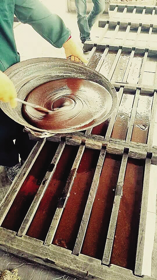 6.起糖。由最初的甘蔗汁→糖水→糖浆(整个过程6-10小时)。整个过程要注意时间、火候、色泽、黏度等,起糖早,火候清,难以凝固;晚了,火候重,糖有苦味。