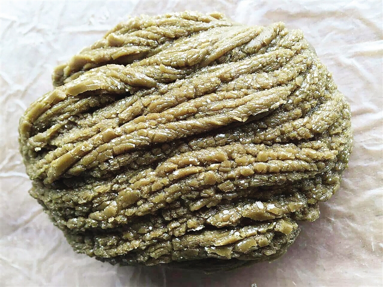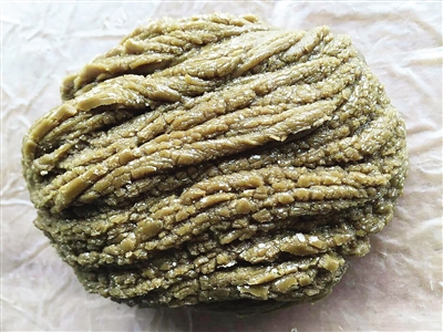 7.成糖。坨糖:起糖后(稍微比糖条起糖早些时间)将糖浆装入小铁锅中,用预先备好的木棒不停搅拌,要求力度均衡,速度适中。大约20分钟后,糖浆凝固欲成粒状,呈浅褐色,再用小铁铲将凝固后的糖浆弄成团状铲出即可。