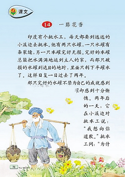 本学期,我任教四年级。苏教版四年级上册的语文第15课《一路花香》,课文是这样的: