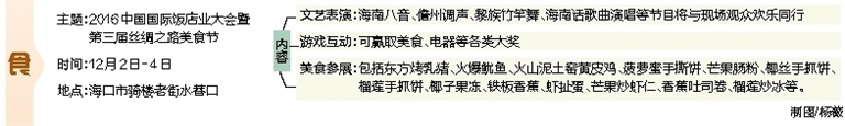 届时每天将有上万名国内外游客和海南人民一起现场品尝丝绸之路沿线地区及海南特色美食。参展美食包括东方烤乳猪、火爆鱿鱼、火山泥土窑黄皮鸡、菠萝蜜手撕饼、芒果肠粉、椰丝手抓饼、榴莲手抓饼、椰子果冻等。