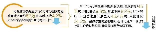 相关统计数据显示,2015年我国天然橡胶累计产量约82万吨,同比下降4.3%,近5年来首次出现产量的同比下降。整体来看,供需失衡局面仍然持续,2015年天然橡胶市场价格持续下行,期货与成胶价格均一度跌破万元大关,创出7年新低。