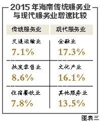 释放服务业和消费的市场活力。2011-2015年,海南服务业年均增长10.6%,快于GDP增速1.1个百分点;海南服务业对经济增长的贡献率高于50%,高于工业部门约20-30个百分点;2015年达到61.4%,2016年上半年提高到72.7%,高出全国同期平均水平(59.7%)13个百分点。从服务业内部结构来看,现代服务业增速明显高于传统服务业(见表三)。预计到2020年,海南服务业比重将达到65%左右,由此,消费对经济增长贡献率将明显增大。